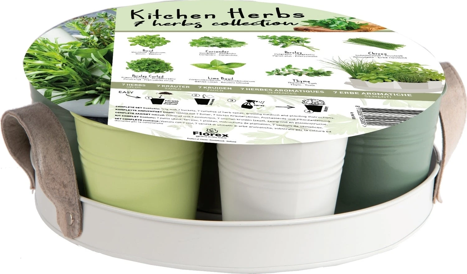 Kweek de 7 meest populaire keukenkruiden lekker zelf, supervers. Compleet met voldoende zaaiaarde en zaden op een fraai dienblad. Basilicum, Koriander, Peterselie, Citorenbasilicum, Bieslook, Krulpeterselie en Tijm. Vul de emmertjes met de bijbehorende grond, maak de grond vochtig. Zakjes zaad gelijkmatig uitzaaien en bedekken met de rest van de grond, zodat het zaad niet meer zichtbaar is. Regelmatig vochtigheid controleren.