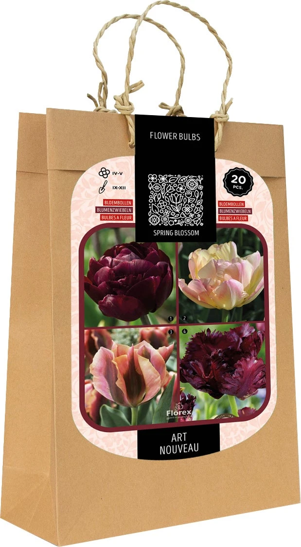 Een fraaie selectie van mooi gecombineerde bloembollen in een handige tas. De tulpen zijn in het rood roze en oranje, 20 stuks.