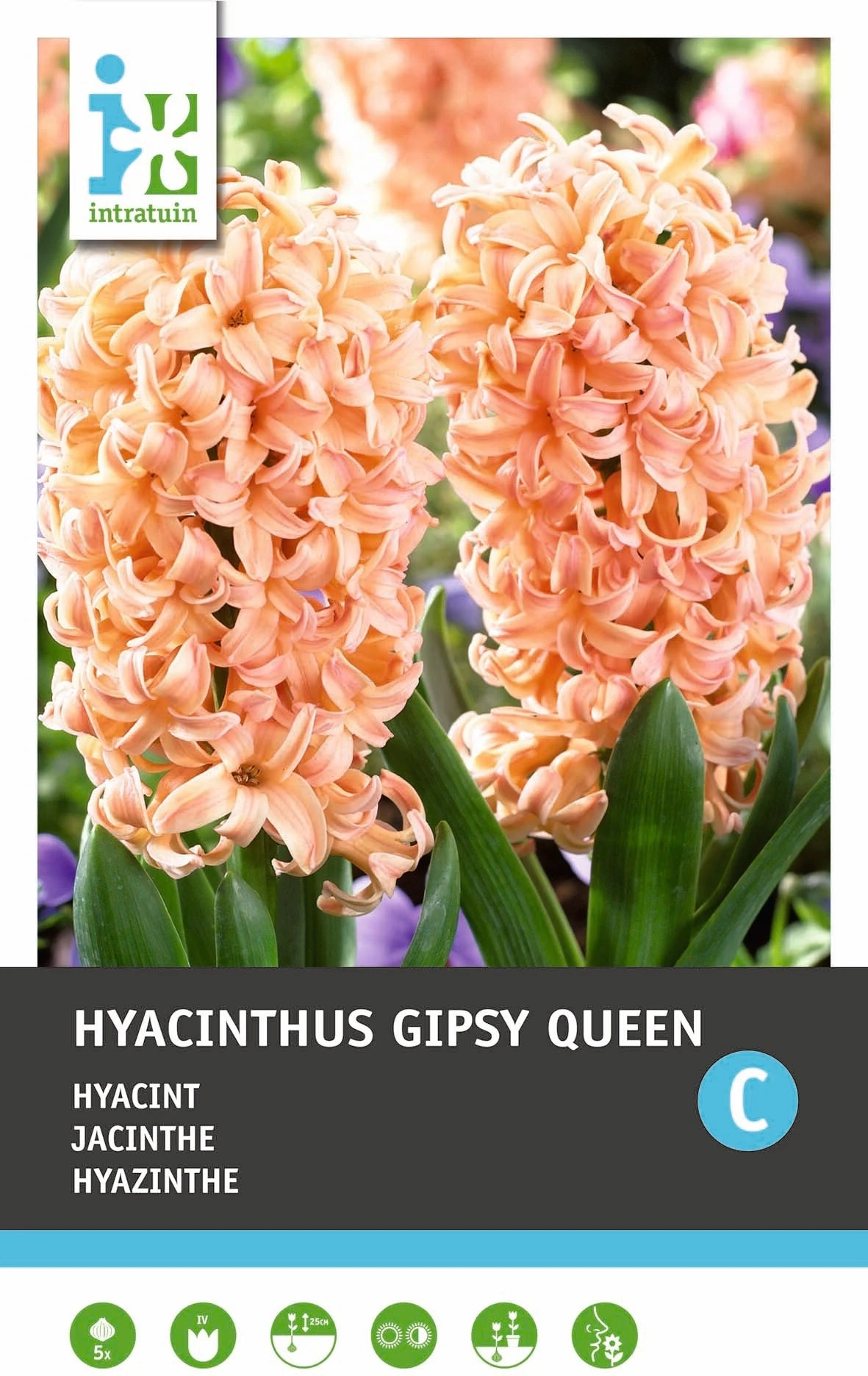 De Hyacinth ‘Gipsy Queen’ krijgt zalmroze bloemen, die in een compacte tros zitten aan een stengel van 20-30 cm hoogte. De bloei is in april-mei op een plaats in de zon of lichte schaduw. Deze bloembollen kunnen zowel in de tuin als in een bloempot op het terras worden gezet. Ze zijn winterhard en komen ieder jaar weer in bloei, mits de uitgebloeide bloem eraf geknipt wordt en het blad de tijd krijgt om rustig af te sterven. In een bloempot is bij strenge vorst wel bescherming nodig, de bloempot zou ook tijdelijk op een vorstvrije plaats gezet kunnen worden. De bloemen geuren heerlijk zoet en trekken daarmee bijen en hommels aan, die in de bloemen hun voedsel vinden. Mooi in combinatie met gele Primula’s of de wit bloeiende Scheefkelk, voor een kleurrijk voorjaar.