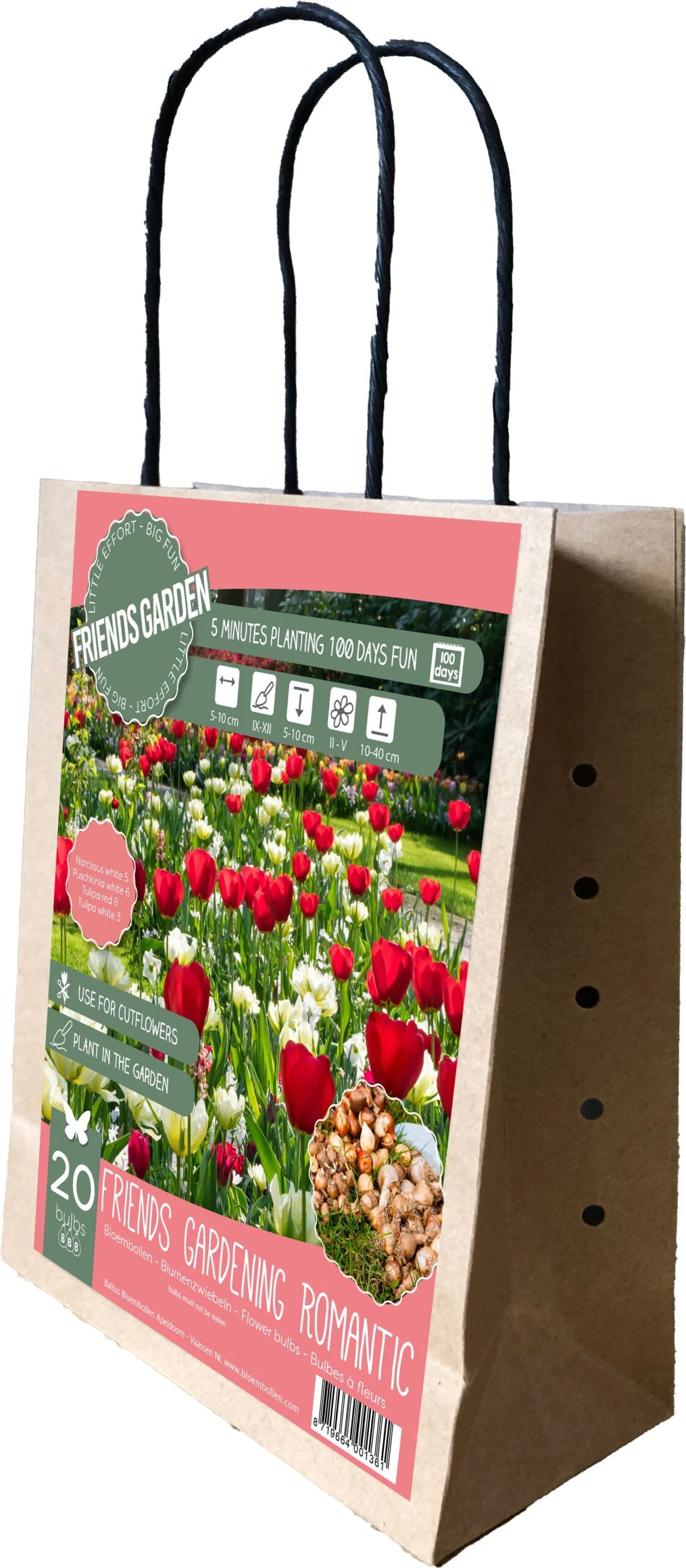 Een prachtige mix van een aantal verschillende tulpen gecombineerd met Puschkinia en Narcis wit. Samen maakt dit een romantische sfeer in uw tuin of border. Verpakt in een cadeautas, dus ook leuk om weg te geven. Speciaal geschikt om een leuke bloementuin aan te leggen en zelf te plukken.